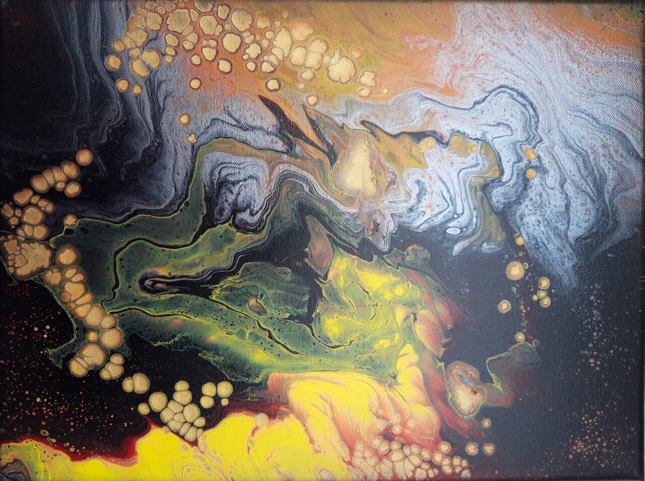 Los acrílicos tienen la consistencia y la gama casi infinita de colores para representar mis obras de arte. Su maleabilidad me permiten hacer estas creaciones abstractas ya sean cuando trabajo con material de reciclaje o cuando los trabajo como acrílicos fluidos.